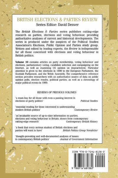 Public opinion and the impeachment of Bill Clinton Gary C.Jacobson; were traditional labour voters disillusioned with New Labour? Abstention at the 1997 general election Anthony Heath; the neighbourhood effect and voting in England and Wales: real or imagined? Ron Johnston Charles Pattie Danny Dorling Iain MacAllister Helena Tunstall David Rossiter; party preference structure in England 1987-97 Stephen D.Fisher; identifying an attitudinal heartland of Liberal Democrat support in the 1997 general election Andrew Russell Ed Fieldhouse; Mr Blair's loyal opposition? The Liberal Democrats in parliament Philip Cowley Darren Darcy Colin Mellors Jon Neal Mark Stuart; constitutional nationalism and socialism in Northern Ireland: the greening of the Social Democratic and Labour Party Jocelyn A.J.Evans Jonathan Tonge Gerard Murray; small kingdoms and crumbling organizations Justin Fisher; candidate selection devolution and modernization Jonathan Bradbury James Mitchell Lyn Bennie David Denver; an outsider's medium? The European elections and UK party competition on the Internet Rachel Gibson Steven Ward; and now for the Commons? Lessons from Britain's first experience with proportional representation John Curtice Michael Steed; proportionality and disproportionality in English County government 1973-97 Colin Rallings Michael Thrasher Christine Gunter
