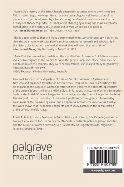 This book focuses on the departure of Britain's 'surplus' women to Australia and New Zealand organised by Victorian British female emigration societies. Starting with an analysis of the surplus of women question, it then explores the philanthropic nature of the organisations (the Female Middle Class Emigration Society, the Women's Emigration Society, the British Women's Emigration Association, and the Church Emigration Society). The study of the strict selection of distressed gentlewomen emigrants is followed by an analysis of their marketing value, and an appraisal of women's imperialism. Finally, this work shows that the female emigrants under study partook in the consolidation of the colonial middle-class.