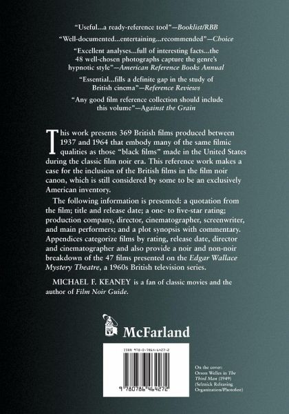 This work presents 369 British films produced between 1937 and 1964 that embody many of the same filmic qualities as those "black films" made in the United States during the classic film noir era. This reference work makes a case for the inclusion of the British films in the film noir canon, which is still considered by some to be an exclusively American inventory. In the book's main section, the following information is presented for each film: a quote from the film; the title and release date; a rating based on the five-star system; the production company, director, cinematographer, screenwriter, and main performers; and a plot synopsis with author commentary. Appendices categorize films by rating, release date, director and cinematographer and also provide a noir and non-noir breakdown of the 47 films presented on the Edgar Wallace Mystery Theatre, a 1960s British television series that was also shown in the United States.