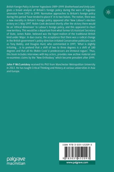 British Foreign Policy in former Yugoslavia 1989-1999: Brotherhood and Unity Lost, gives a broad analysis of Britain's foreign policy during the wars of Yugoslav secessions from 1992 to 1999. Normative approaches to Britain's foreign policy during this period 'have tended to place it' in to two halves. The notion, there was a new morality in Britain's foreign policy appeared after New Labour's election landslide on 1 May 1997. Robin Cook declared shortly after the victory there would be an 'ethical dimension' to Labour's foreign policy, and this appeared to chart new territory. As a result, this would be a departure from what former US Assistant Secretary of State, James Rubin, believed was the hyper-realism of the traditional British kind under British Prime Minister, John Major. The book includes interviews with key actors, provides new archive material and re-examines claims by the 'New Orthodoxy' which became prevalent after 1999.