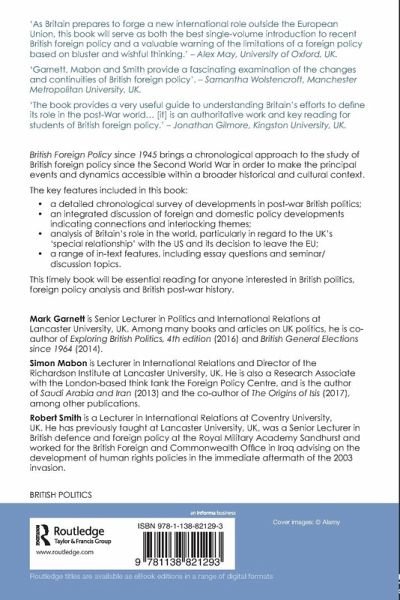 "British Foreign Policy Since 1945 provides an authoritative and comprehensive evaluation of the critical developments in British foreign policy in the post-war era. Tailored to the needs of lecturers, teachers and students of British politics, the book will facilitate a thorough understanding of the principal themes of British foreign policy - the main factors, events and issues by which foreign policy has been shaped. Garnett, Mabon and Smith provide a fascinating examination of the changes and continuities of British foreign policy." - Samantha Wolstencroft, Manchester Metropolitan University, UK