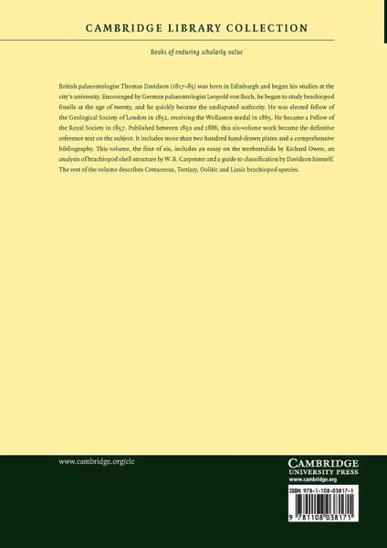 British palaeontologist Thomas Davidson (1817-85) was born in Edinburgh and began his studies at the city's university. Encouraged by German palaeontologist Leopold von Buch, he began to study brachiopod fossils at the age of twenty, and he quickly became the undisputed authority. He was elected fellow of the Geological Society of London in 1852, receiving the Wollaston medal in 1865. He became a Fellow of the Royal Society in 1857. Published between 1850 and 1886, this six-volume work became the definitive reference text on the subject. It includes more than two hundred hand-drawn plates and a comprehensive bibliography. This volume, the first of six, includes an essay on the terebratulids by Richard Owen, an analysis of brachiopod shell structure by W. B. Carpenter and a guide to classification by Davidson himself. The rest of the volume describes Cretaceous, Tertiary, Oolitic and Liasic brachiopod species.