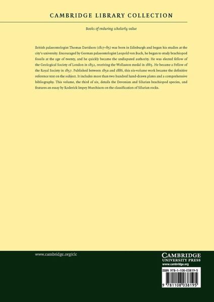 British palaeontologist Thomas Davidson (1817-85) was born in Edinburgh and began his studies at the city's university. Encouraged by German palaeontologist Leopold von Buch, he began to study brachiopod fossils at the age of twenty, and he quickly became the undisputed authority. He was elected fellow of the Geological Society of London in 1852, receiving the Wollaston medal in 1865. He became a Fellow of the Royal Society in 1857. Published between 1850 and 1886, this six-volume work became the definitive reference text on the subject. It includes more than two hundred hand-drawn plates and a comprehensive bibliography. This volume, the third of six, details the Devonian and Silurian brachiopod species, and features an essay by Roderick Impey Murchison on the classification of Silurian rocks.