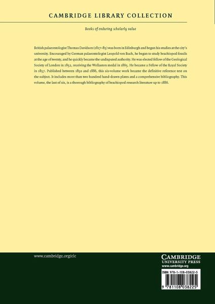 British palaeontologist Thomas Davidson (1817-85) was born in Edinburgh and began his studies at the city's university. Encouraged by German palaeontologist Leopold von Buch, he began to study brachiopod fossils at the age of twenty, and he quickly became the undisputed authority. He was elected fellow of the Geological Society of London in 1852, receiving the Wollaston medal in 1865. He became a Fellow of the Royal Society in 1857. Published between 1850 and 1886, this six-volume work became the definitive reference text on the subject. It includes more than two hundred hand-drawn plates and a comprehensive bibliography. This volume, the last of six, is a thorough bibliography of brachiopod research literature up to 1886.