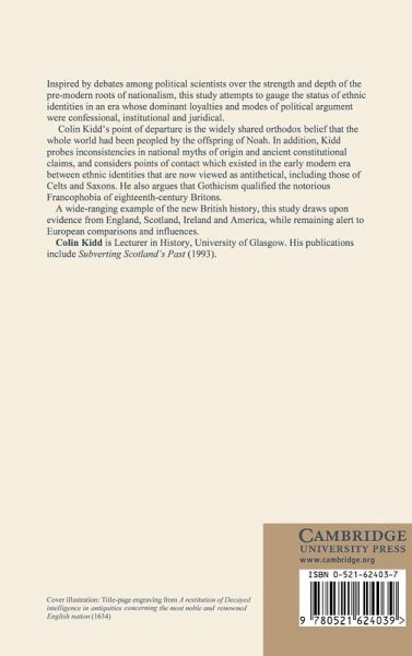 Inspired by debates among political scientists over the strength and depth of the pre-modern roots of nationalism, this study attempts to gauge the status of ethnic identities in an era whose dominant loyalties and modes of political argument were confessional, institutional and juridical. Colin Kidd's point of departure is the widely shared orthodox belief that the whole world had been peopled by the offspring of Noah. In addition, Kidd probes inconsistencies in national myths of origin and ancient constitutional claims, and considers points of contact which existed in the early modern era between ethnic identities which are now viewed as antithetical, including those of Celts and Saxons. He also argues that Gothicism qualified the notorious Francophobia of eighteenth-century Britons. A wide-ranging example of the new British history, this study draws upon evidence from England, Scotland, Ireland and America, while remaining alert to European comparisons and influences.