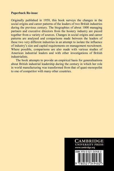 Originally published in 1959, this book surveys the changes in the social origins and career patterns of the leaders of two British industries during the previous century. The biographies of about 1000 managing partners and executive directors from the hosiery industry are pieced together from a variety of sources. Changes in social origins and career patterns are analysed and comparisons made between the leaders of these two very different industries in an attempt to isolate the influence of industry's size and capital requirements on management recruitment. Where possible, comparisons are also made with various studies of American industrial leaders and with other investigations of British industrialists. The book attempts to provide an empirical basis for generalisations about British industrial leadership during the century in which her role in world manufacturing was transformed from that of quasi-monopolist to one of competitor with many other countries.