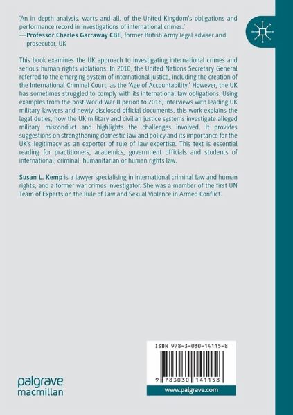 This book examines the UK approach to investigating international crimes and serious human rights violations. In 2010, the United Nations Secretary General referred to the emerging system of international justice, including the creation of the International Criminal Court, as the 'Age of Accountability.' However, the UK has sometimes struggled to comply with its international law obligations. Using examples from the post-World War II period to 2018, interviews with leading UK military lawyers and newly disclosed official documents, this work explains the legal duties, how the UK military and civilian justice systems investigate alleged military misconduct and highlights the challenges involved. It provides suggestions on strengthening domestic law and policy and its importance for the UK's legitimacy as an exporter of rule of law expertise. This text is essential reading for practitioners, academics, government officials and students of international, criminal, humanitarian orhuman rights law.