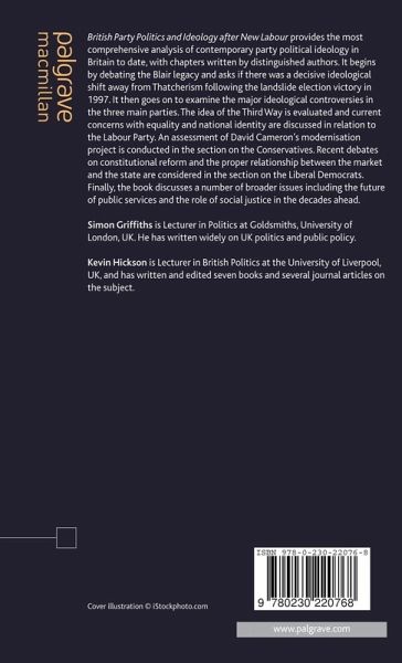 Preface; D.Owen Introduction; K.Hickson& S.Griffiths SECTION I: DID BLAIR ADVANCE SOCIAL DEMOCRACY?; A.Finlayson, D.Kavanagh& J.Tonge SECTION II: LABOUR AFTER BLAIR Assessing the Impact of the Third Way; J.Atkins What makes Progressive Ideology?: Lessons from the Third Way; W.Leggett Response to Atkins and Leggett; T.Giddens New Labour, New Liberalism and Revisionism's Second Wave; S.Griffiths Response to Griffiths; R.Hattersley Gordon Brown, 'Britishness' and the Negation of England; S.Lee Response to Lee; A.Aughey SECTION III: THE CONSERVATIVES UNDER CAMERON Built on Sand? Ideology and Conservative Modernization under David Cameron; M.Garnett Cameron, Modernization and Conservative Britain; P.Lynch Response to Garnett and Lynch; A.Gamble Mutualism and the Reinvention of Civil Society: A Conservative Agenda?; C.Ellis Response to Ellis; D.Willetts SECTION IV: WHERE NOW FOR THE LIBERAL DEMOCRATS? Icarus Turns Back: Liberal Democrat Constitutional Policy; M.Cole The Liberal Democrats and the Role of the State; D.Brack Response to Cole and Brack; A.Beith SECTION V: CROSS PARTY DEBATES Reforming Public Services: The Views of the Main Parties; R.Prabhakar Response to Prabhakar; N.Thompson The Continuing Relevance of Social Justice; R.Plant Response to Plant; D.Willetts