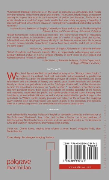 "British Romanticism invented the modern media - the literary lower empire of magazines and reviews explored in Schoenfield s new book. In a series of supple, vivid case studies, Schoenfield tracks the forging of literary identity in the Romantic culture wars. He shows us a noisier, funnier, bloodier Romanticism than we have been used to, and it will never look the sameagain." - Ian Duncan, Department of English, University of California, Berkeley