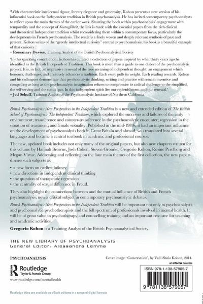 British Psychoanalysis: New Perspectives in the Independent Tradition is a new and extended edition of The British School of Psychoanalysis: The Independent Tradition, which explored the successes and failures of the early environment; transference and counter-transference in the psychoanalytic encounter; regression in the situation of treatment; and female sexuality. Published in the mid-1980s, it had an important influence on the development of psychoanalysis both in Great Britain and abroad, was translated into several languages and became a central textbook in academic and professional courses.