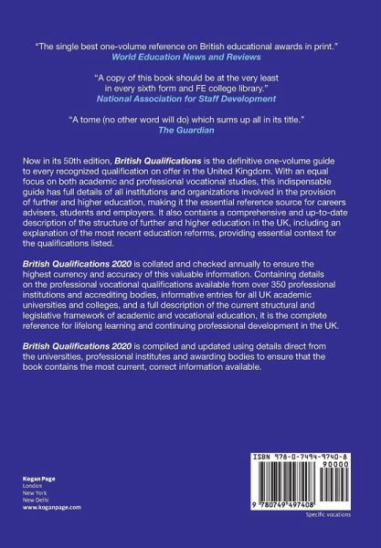 Now in its 50th edition, British Qualifications 2020 is the definitive one-volume guide to every recognized qualification on offer in the United Kingdom. With an equal focus on both academic and professional vocational studies, this indispensable guide has full details of all institutions and organizations involved in the provision of further and higher education, making it the essential reference source for careers advisers, students, and employers. It also contains a comprehensive and up-to-date description of the structure of further and higher education in the UK, including an explanation of the most recent education reforms, providing essential context for the qualifications listed. British Qualifications 2020 is compiled and checked annually to ensure the highest currency and accuracy of this valuable information. Containing details on the professional vocational qualifications available from over 350 professional institutions and accrediting bodies, informative entries for all UK academic universities and colleges, and a full description of the current structural and legislative framework of academic and vocational education, it is the complete reference for lifelong learning and continuing professional development in the UK.