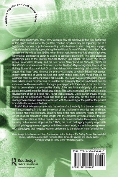 British Rock Modernism, 1967-1977 explains how the definitive British rock performers of this epoch aimed, not at the youthful rebellion for which they are legendary, but at a highly self-conscious project of commenting on the business in which they were engaged. They did so by ironically appropriating the traditional forms of Victorian music hall. Faulk focuses on the mid to late 1960s, when British rock bands who had already achieved commercial prominence began to aspire to aesthetic distinction. The book discusses recordings such as the Beatles' Magical Mystery Tour album, the Kinks' The Village Green Preservation Society, and the Sex Pistols' Never Mind the Bollocks, Here's the Sex Pistols, and television films such as the Beatles' Magical Mystery Tour and the Rolling Stones' Rock and Roll Circus that defined rock's early high art moment. Faulk argues that these 'texts' disclose the primary strategies by which British rock groups, mostly comprised of young working and lower middle-class men, made their bid for aesthetic merit by sampling music hall sounds. The result was a symbolically charged form whose main purpose was to unsettle the hierarchy that set traditional popular culture above the new medium. Rock groups engaged with the music of the past in order both to demonstrate the comparative vitality of the new form and signify rock's new art status, compared to earlier British pop music. The book historicizes punk rock as a later development of earlier British rock, rather than a rupture. Unlike earlier groups, the Sex Pistols did not appropriate music hall form in an ironic way, but the band and their manager Malcolm McLaren were obsessed with the meaning of the past for the present in a distinctly modernist fashion.