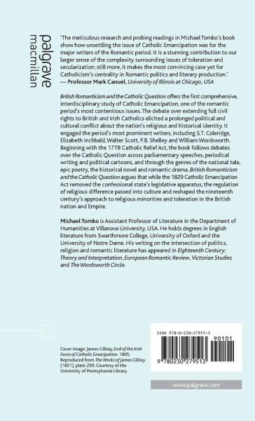 The debate over extending full civil rights to British and Irish Catholics not only preoccupied British politics but also informed the romantic period's most prominent literary works. This book offers the first comprehensive, interdisciplinary study of Catholic Emancipation, one of the romantic period's most contentious issues.