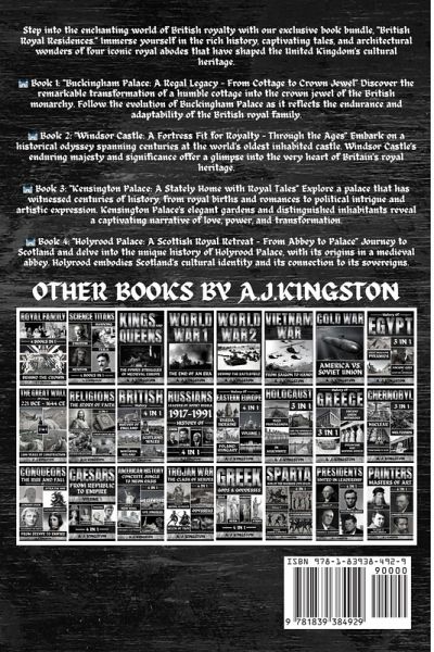 Introducing "British Royal Residences" - A Majestic Journey Through Time and Tradition Step into the enchanting world of British royalty with our exclusive book bundle, "British Royal Residences." Immerse yourself in the rich history, captivating tales, and architectural wonders of four iconic royal abodes that have shaped the United Kingdom's cultural heritage. ¿¿¿¿ Book 1: "Buckingham Palace: A Regal Legacy - From Cottage to Crown Jewel" Discover the remarkable transformation of a humble cottage into the crown jewel of the British monarchy. Follow the evolution of Buckingham Palace as it reflects the endurance and adaptability of the British royal family. ¿¿¿¿ Book 2: "Windsor Castle: A Fortress Fit for Royalty - Through the Ages" Embark on a historical odyssey spanning centuries at the world's oldest inhabited castle. Windsor Castle's enduring majesty and significance offer a glimpse into the very heart of Britain's royal heritage. ¿¿¿¿ Book 3: "Kensington Palace: A Stately Home with Royal Tales" Explore a palace that has witnessed centuries of history, from royal births and romances to political intrigue and artistic expression. Kensington Palace's elegant gardens and distinguished inhabitants reveal a captivating narrative of love, power, and transformation. ¿¿¿¿ Book 4: "Holyrood Palace: A Scottish Royal Retreat - From Abbey to Palace" Journey to Scotland and delve into the unique history of Holyrood Palace, with its origins in a medieval abbey. Holyrood embodies Scotland's cultural identity and its connection to its sovereigns. What Awaits You: ¿¿¿¿ Secrets Unveiled: Discover hidden stories, legends, and intrigues that have unfolded within these hallowed walls. ¿¿¿¿ Lives Lived: Explore the lives of monarchs, residents, and the cultural tapestry that defines each palace. ¿¿¿¿ Cultural Heritage: Experience the art, culture, and traditions that have thrived within these royal residences. ¿¿¿¿ Architectural Marvels: Immerse yourself in the grandeur and elegance of these extraordinary palaces. Whether you're a history enthusiast, architecture aficionado, or simply curious about the royal experience, "British Royal Residences" promises an unforgettable journey through time and heritage. Preserve your piece of British history and order this limited-time book bundle today. Dive into the world of royalty and explore the stories that have shaped a nation. Don't miss your chance to own this captivating collection of books that celebrate the enduring legacy of British royal residences. Order now and embark on a majestic journey through the annals of history and tradition!