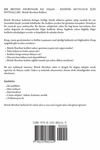 B¿R BRITISH SHORTHAIR ¿LE YA¿AM - KED¿N¿N MUTLULUK ¿Ç¿N ¿HT¿YAÇLARI - British Shorthair Rehberi British Shorthair kedisinin belirgin özelli¿i, büyük etkileyici gözlere sahip yuvarlak bir yüz üzerindeki küçük yuvarlak kulaklard¿r. Bu, kedilere çocuksu bir görünüm kazand¿r¿r. Neredeyse bir oyuncak ay¿y¿ and¿r¿yorlar. Bu durum, sahipleriyle yak¿n bir bä kuran hayvanlar¿n dost canl¿s¿ do¿as¿yla da örtü¿mektedir. Di¿er kedilerin aksine, ¿ngilizler yaln¿z de¿ildir. Di¿er kedilerin arkadäl¿¿¿n¿ severler ve köpeklerle de arkadä olurlar. Kitap, cinsin gereksinimleri ve birlikte yäaman¿n nas¿l i¿ledi¿i hakk¿nda sizi bilgilendirir. Kitap ää¿daki gibi sorular¿ yan¿tl¿yor:British Shorthair kedileri sadece apartman yäam¿ için uygun mudur? Palto bak¿m¿ ne kadar zaman al¿r? Kedinin hangi mamaya ihtiyac¿ var? Hayvan¿ kum kab¿na nas¿l al¿¿t¿rabilirim? British Shorthair kedimi säl¿kl¿ tutmak için nelere dikkat etmeliyim? Bir ¿eyi aç¿klamak istiyoruz: British Shorthair sakin ve dengeli bir do¿aya sahiptir, ancak egzersize de ihtiyac¿ vard¿r. Sadece iç mekanda tutuyorsan¿z, bunun eksik olmad¿¿¿ndan emin olmal¿s¿n¿z. ¿çindekiler:Irk özellikleri Irk¿n tarihçesi Irk¿n karakteri Cinsin talepleri - bak¿m, beslenme, meslek 10 illüstrasyon ile British Shorthair kedinizle bir tak¿m olun ve onu nas¿l sevgiyle idare edece¿inizi ö¿renin!