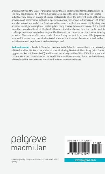 British Theatre and the Great War examines how theatre in its various forms adapted itself to the new conditions of 1914-1918. Contributors discuss the roles played by the theatre industry. They draw on a range of source materials to show the different kinds of theatrical provision and performance cultures in operation not only in London but across parts of Britain and also in Australia and at the Front. As well as recovering lost works and highlighting new areas for investigation (regional theatre, prison camp theatre, troop entertainment, the threat from film, suburban theatre) the book offers revisionist analysis of how the conflict and its challenges were represented on stage at the time and the controversies it provoked. The volume offers new models for exploring the topic in an accessible, jargon-free way, and it shows how theatrical entertainment of the time can be seen as the`missing link' in the study of First World War writing.