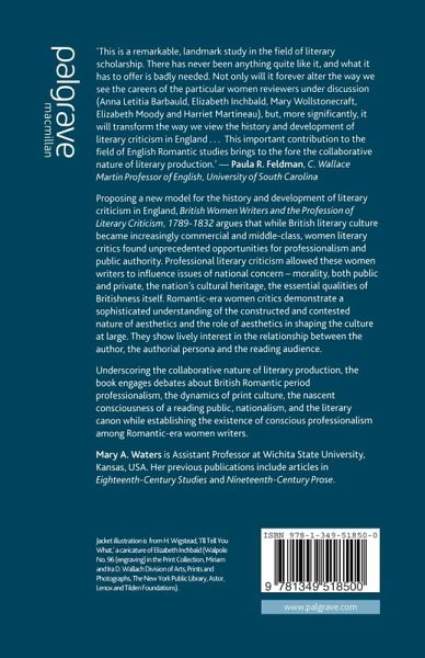 'This is a remarkable, landmark study in the field of literary scholarship. There has never been anything quite like it, and what it has to offer is badly needed. Not only will it forever alter the way we see the careers of the particular women reviewers under discussion (Anna Letitia Barbauld, Elizabeth Inchbald, Mary Wollstonecraft, Elizabeth Moody and Harriet Martineau), but, more significantly, it will transform the way we view the history and development of literary criticism in England... This important contribution to the field of English Romantic studies brings to the fore the collaborative nature of literary production.' - Paula R. Feldman, C. Wallace Martin Professor of English, University of South Carolina