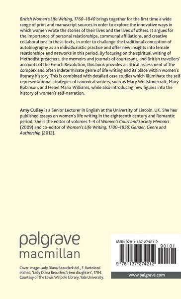 "In her study of women's life writing in manuscript and in print, Amy Culley persuasively argues for a rethinking of the theory and practice of self- representation in the late eighteenth and early nineteenth centuries. ... Engaging throughout with existing scholarship, this is an innovative and incisive study which significantly advances our understanding of women's life writing." (Anna M. Fitzer, Sharp News, Vol. 24 (4), 2015)