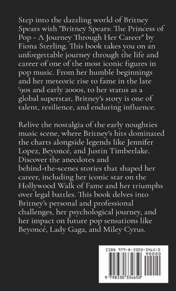 Step into the dazzling world of Britney Spears with "Britney Spears: The Princess of Pop - A Journey Through Her Career" by Fiona Sterling. This book takes you on an unforgettable journey through the life and career of one of the most iconic figures in pop music. From her humble beginnings and her meteoric rise to fame in the late '90s and early 2000s, to her status as a global superstar, Britney's story is one of talent, resilience, and enduring influence. Relive the nostalgia of the early noughties music scene, where Britney's hits dominated the charts alongside legends like Jennifer Lopez, Beyoncé, and Justin Timberlake. Discover the anecdotes and behind-the-scenes stories that shaped her career, including her iconic star on the Hollywood Walk of Fame and her triumphs over legal battles. This book delves into Britney's personal and professional challenges, her psychological journey, and her impact on future pop sensations like Beyoncé, Lady Gaga, and Miley Cyrus. Fiona Sterling, a lifelong fan, and music enthusiast, offers a heartfelt tribute to the artist who inspired her love for music. Whether you're a die-hard Britney fan or a music history aficionado, this book is a must-read for anyone looking to understand the legacy of the Princess of Pop.