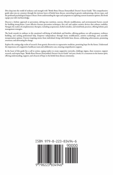 Dive deep into the world of resilience and strength with "Brittle Bone Disease Demystified: Doctor's Secret Guide." This comprehensive guide takes you on a journey through the intricate layers of brittle bone disease, unraveling its genetic underpinnings, diverse types, and the profound psychological impact it bears. From understanding the signs and symptoms to exploring current treatment options, this book equips you with vital knowledge. Discover a holistic approach to prevention, delving into nutrition, exercise, lifestyle modifications, and environmental factors crucial for building strong bones. Learn effective fracture prevention techniques, first aid, and explore assistive devices that enhance mobility. Navigate the realms of complementary therapies, including acupuncture, herbal remedies, and mind-body practices, offering holistic pain management strategies. The book extends its embrace to the emotional well-being of individuals and families, offering guidance on self-acceptance, resilience building, and seeking professional help. Empower independence through home modifications, assistive technology, and accessible transportation options. Uncover inspiring stories from individuals living with brittle bone disease, celebrating achievements, promoting awareness, and advocating for change. Explore the cutting-edge realm of research, from genetic discoveries to regenerative medicine, promising hope for the future. Understand the importance of a supportive healthcare team and collaborative care, ensuring comprehensive support. In the heart of this guide lies a call to action, urging readers to create supportive networks, challenge stigma, share resources, support research, and inspire hope. "Brittle Bone Disease Demystified: Doctor's Secret Guide" isn't just a book; it's a testament to the human spirit, offering understanding, support, and a beacon of hope to the brittle bone disease community.