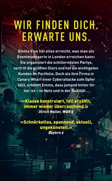 Emma Vine hat alles erreicht, was man als Eventmanagerin in London erreichen kann: Sie organisiert die schillerndsten Partys, vertritt die größten Stars und hat die wichtigsten Kunden im Portfolio. Doch als ihre Firma in Canary Wharf einer Cyberattacke zum Opfer fällt, erkennt Emma, dass jemand hinter ihr her ist - im Netz und in der Realität ...