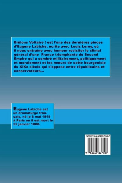 Brûlons Voltaire ! est l'une des dernières pièces d'Eugène Labiche, écrite avec Louis Leroy, où il nous entraîne avec humour revisiter le climat général d'une France triomphante du Second Empire qui a sombré militairement, politiquement et moralement et les murs de cette bourgeoisie du XIXe siècle qui s'oppose entre républicains et conservateurs...
