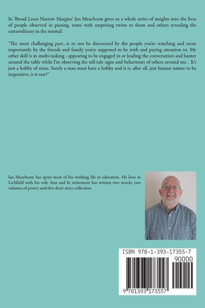 In 'Broad Lines Narrow Margins' Ian Meacheam gives us a whole series of insights into the lives of people observed in passing, some with surprising twists to them and others revealing the extraordinary in the normal. "The most challenging part...is to not be discovered by the people you're watching and more importantly by the friends and family you're supposed to be with and paying attention to. My other skill is in multi-tasking - appearing to be engaged in or leading the conversation and banter around the table while I'm observing the tell-tale signs and behaviours of others around me. . It's just a hobby of mine. Surely a man must have a hobby and it is, after all, just human nature to be inquisitive, is it not?"