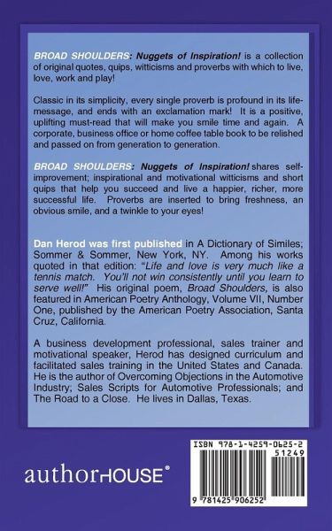 BROAD SHOULDERS: Nuggets of Inspiration! is a collection of original quotes, quips, witticisms and proverbs with which to live, love, work and play! Classic in its simplicity, every single proverb is profound in its life-message, and ends with an exclamation mark! It is a positive, uplifting must-read that will make you smile time and again. A corporate, business office or home coffee table book to be relished and passed on from generation to generation. BROAD SHOULDERS: Nuggets of Inspiration! shares self-improvement; inspirational and motivational witticisms and short quips that help you succeed and live a happier, richer, more successful life. Proverbs are inserted to bring freshness, an obvious smile, and a twinkle to your eyes!