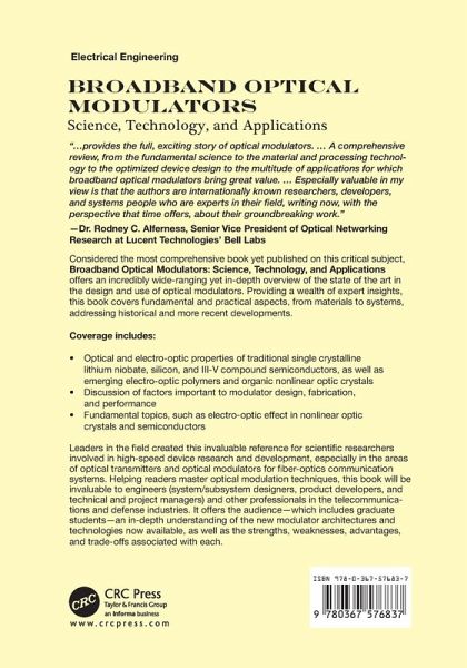 "...provides the full, exciting story of optical modulators. ... a comprehensive review, from the fundamental science to the material and processing technology to the optimized device design to the multitude of applications for which broadband optical modulators bring great value. ... Especially valuable in my view is that the authors are internationally known researchers, developers, and systems people who are experts in their field, writing now, with the perspective that time offers, about their groundbreaking work. " -Dr. Rodney C. Alferness, Senior Vice President of Optical Networking Research at Lucent Technologies' Bell Labs Considered the most comprehensive book yet published on this critical subject, Broadband Optical Modulators: Science, Technology, and Applications offers an incredibly wide-ranging yet in-depth overview of the state of the art in the design and use of optical modulators. A compilation of expert insights, this book covers fundamental and practical aspects, from materials to systems, addressing historical and more recent developments. Coverage includes: Optical and electro-optic properties of traditional single crystalline lithium niobate, silicon, and III-V compound semiconductors, as well as emerging electro-optic polymers and organic nonlinear optic crystals Discussion of factors important to modulator design, fabrication, and performance Fundamental topics, such as electro-optic effect in nonlinear optic crystals and semiconductors Leaders in the field created this invaluable reference for scientific researchers involved in high-speed device research and development, especially in the areas of optical transmitters and optical modulators for fiber-optics communication systems. Helping readers master optical modulation techniques, this book will be invaluable to engineers (system/subsystem designers, product developers, and technical and project managers) and other professionals in the telecommunications and defense industries. It offers the audience-which includes graduate students-an in-depth understanding of the new modulator architectures and technologies now available, as well as the strengths, weaknesses, advantages, and trade-offs associated with each.