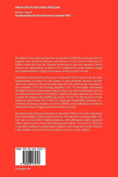 Broadband Opto-Electrical Receivers in Standard CMOS starts from the basic fundamentals necessary for the design of opto-electronic interface circuits. The book continues with an in-depth analysis of the photodiode, transimpedance amplifier (TIA) and limiting amplifier (LA). To thoroughly understand the light detection mechanisms in silicon, first a one-dimensional and second a two-dimensional model is developed. Analytical design equations are derived to guide the design of the amplifying circuits. For the TIA, the focus is on the sensitivity-speed trade-off. For the LA, a high gain-bandwidth is pursued. Several practical design examples reveal the subtleties and challenges encountered during the design of high-performance analog circuits.