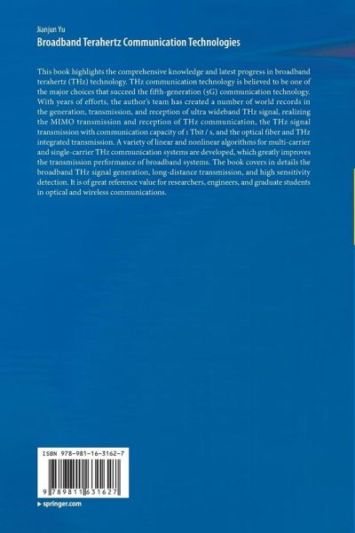 This book highlights the comprehensive knowledge and latest progress in broadband terahertz (THz) technology. THz communication technology is believed to be one of the major choices that succeed the fifth-generation (5G) communication technology. With years of efforts, the author's team has created a number of world records in the generation, transmission, and reception of ultra wideband THz signal, realizing the MIMO transmission and reception of THz communication, the THz signal transmission with communication capacity of 1 Tbit / s, and the optical fiber and THz integrated transmission. A variety of linear and nonlinear algorithms for multi-carrier and single-carrier THz communication systems are developed, which greatly improves the transmission performance of broadband systems. The book covers in details the broadband THz signal generation, long-distance transmission, and high sensitivity detection. It is of great reference value for researchers, engineers, and graduate students in optical and wireless communications.