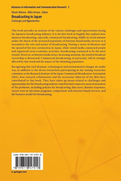 The Concept of "Communications" and "Broadcasting" in the Era of Digital Convergence.- Japan's Broadcasting System from the Perspective of its Demographics in 2040.- An Outlook on Broadcasting in 2036 - The state of broadcasting in the UK and Japanese broadcasting policy.- An International Comparison of Simulcasting and Webcasting: From Facilitating Transmission to Communication to the Public.- The Development of Japanese broadcasting and the Training System.- Business Models for Commercial Broadcasters in Japan - Will there be New Developments in the Digital Age?.- Inter-Media Competition: The Differentiation Strategy and Catch-up Strategy of the Television Industry against the Internet.- How People Respond to Fake News: A Comparison of Japan, South Korea, and Thailand.- Local News in the Digital Age: A Consideration of Disaster Reporting.- Trust in Television and its Relationship with Entertainment Program Preferences.- Television Viewing via the Internet: Time-shift and TVer.- Internet Simulcast Distribution of Broadcast Media: An Assessment of Actual State and Demand.