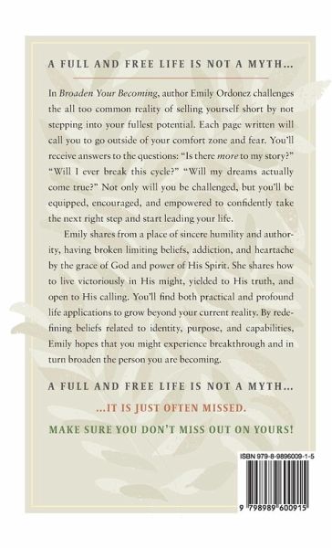 A full and free life is not a myth... In Broaden Your Becoming, author Emily Ordonez challenges the all too common reality of selling yourself short by not stepping into your fullest potential. Each page written will call you to go outside of your comfort zone and fear. You'll receive answers to the questions: "Is there more to my story?" "Will I ever break this cycle?" "Will my dreams actually come true?" Not only will you be challenged, but you'll be equipped, encouraged, and empowered to confidently take the next right step and start leading your life. Emily shares from a place of sincere humility and authority, having broken limiting beliefs, addiction, and heartache by the grace of God and power of His Spirit. She shares how to live victoriously in His might, yielded to His truth, and open to His calling. You'll find both practical and profound life applications to grow beyond your current reality. By redefining beliefs related to identity, purpose, and capabilities, Emily hopes that you might experience breakthrough and in turn broaden the person you are becoming. A full and free life is not a myth... ... it is just often missed. Make sure you don't miss out on yours!