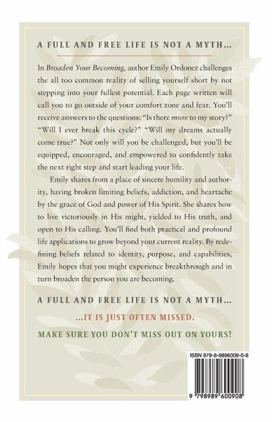 A full and free life is not a myth... In Broaden Your Becoming, author Emily Ordonez challenges the all too common reality of selling yourself short by not stepping into your fullest potential. Each page written will call you to go outside of your comfort zone and fear. You'll receive answers to the questions: "Is there more to my story?" "Will I ever break this cycle?" "Will my dreams actually come true?" Not only will you be challenged, but you'll be equipped, encouraged, and empowered to confidently take the next right step and start leading your life. Emily shares from a place of sincere humility and authority, having broken limiting beliefs, addiction, and heartache by the grace of God and power of His Spirit. She shares how to live victoriously in His might, yielded to His truth, and open to His calling. You'll find both practical and profound life applications to grow beyond your current reality. By redefining beliefs related to identity, purpose, and capabilities, Emily hopes that you might experience breakthrough and in turn broaden the person you are becoming. A full and free life is not a myth... ... it is just often missed. Make sure you don't miss out on yours!