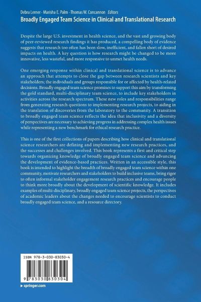 This is one of the first collections of papers describing how clinical and translational science researchers are defining and implementing new research practices, and the successes and challenges involved. This book represents a first and critical step towards organizing knowledge of broadly engaged team science and advancing the development of evidence-based practices. Written in an accessible style, this book is intended to highlight the breadth of broadly engaged team science within one community, motivate researchers and stakeholders to build inclusive teams, bring rigor to often informal stakeholder engagement research practices and encourage people to think more broadly about the development of scientific knowledge. It includes examples of multi-disciplinary, broadly engaged team science projects, the perspectives of academic leaders about the changes needed to encourage scientists to conduct broadly engaged team science, and a resource directory.