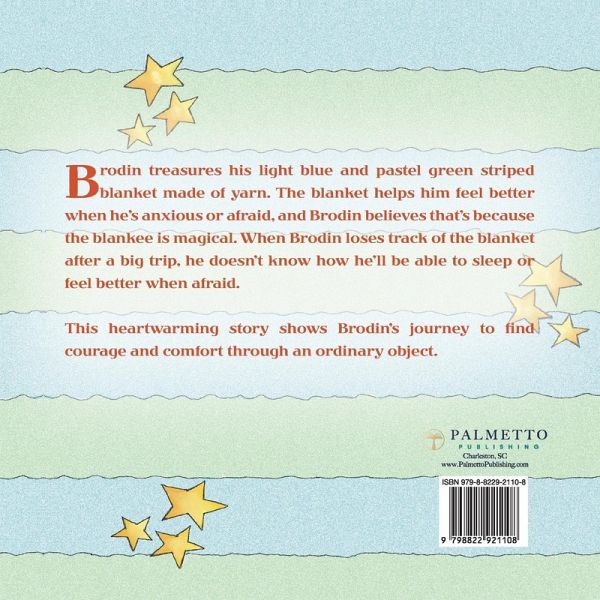 Brodin has a special blanket that helps him get through fear and fall asleep. Brodin believes that his blanket is magic and does not know what he would do without it. But what happens when Brodin doesn't have the blanket? Brodin is a busy little boy who has so much he wants to play and do. Out of all the toys and objects he owns, his absolute favorite must be his special blankee. Brodin's blankee is light blue and pastel green striped. It is knitted out of soft yarn, so there are tiny holes he can barely see through when he puts the blankee over his head. Brodin has had the blankee forever, and he wants to keep the blankee forever too. Brodin's convinced that the blankee is magical. Whenever Brodin feels anxious or afraid, he can curl up with his blankee and begin to feel better. Brodin always sleeps with his magic blankee over his head. Brodin doesn't go anywhere without his magic blankee. One day, after a big trip, Brodin can't find his magic blankee anywhere. How will Brodin sleep? What can Brodin do to make himself feel better when he's sad, scared, or anxious? Brodin's Magic Blankee tells the heartwarming story of a little boy finding courage through his attachment to an ordinary thing. Parents and caregivers can use the book as a conversation starter to let their kids know that it is okay for them to find a way to comfort themselves and that there are many "magical" places they can get courage.