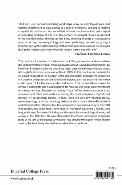 This book is a translation of the famous book "Vergleichende Lokalisationslehre der Grosshirnrinde in ihren Prinzipien dargestellt auf Grund des Zellenbaues" by Korbinian Brodmann, which is one of the major classics of the neurological world. Although Brodmann's book was written in 1909, to this day it forms the basis for so-called "localisation" of function in the cerebral cortex. Brodmann's "areas" are still used to designate cortical functional regions, such as area 4 for the motor cortex, area 17 for the visual cortex and so on. This nomenclature is used by clinical neurologists and neurosurgeons for man, as well as by experimentalists for various animals. Brodmann's famous "maps" of the cerebral cortex of man, monkeys and other mammals are among the most commonly reproduced figures in neurobiology books. In fact, there are very few neuroanatomy, neurophysiology or clinical neurology textbooks which do not refer to Brodmann's cortical localisation. Despite this, few people have ever seen a copy of the 1909 monograph, and even fewer have read it! Professor Laurence J Garey, who frequently used Brodmann's findings and maps in his neurobiological work, had a copy of the 1909 text. He was often asked to provide translations of specific parts of the text by colleagues who neither had access to the book nor an English version. He thus finally decided to translate the whole book.