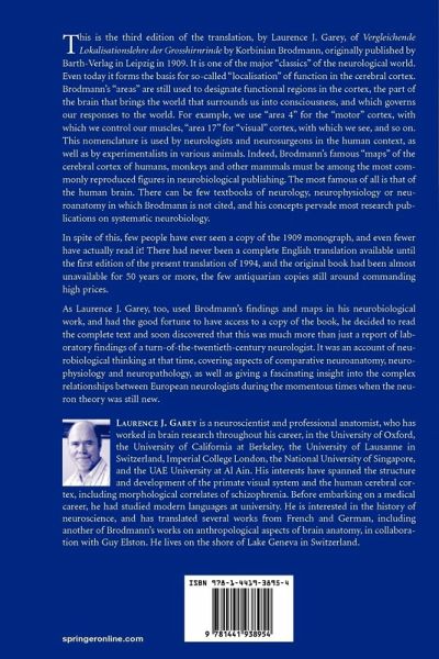 This is the third edition of the translation, by Laurence Garey, of "Vergleichende Lokalisationslehre der Grosshirnrinde" by Korbinian Brodmann, originally published by Barth-Verlag in Leipzig in 1909. It is one of the major "classics" of the neurological world. Even today it forms the basis for so-called "localisation" of function in the cerebral cortex. Brodmann's "areas" are still used to designate functional regions in the cortex, the part of the brain that brings the world that surrounds us into consciousness, and which governs our responses to the world. For example, we use "area 4" for the "motor" cortex, with which we control our muscles, "area 17" for "visual" cortex, with which we see, and so on. This nomenclature is used by neurologists and neurosurgeons in the human context, as well as by experimentalists in various animals. Indeed, Brodmann's famous "maps" of the cerebral cortex of humans, monkeys and other mammals must be among the most commonly reproduced figures in neurobiological publishing. The most famous of all is that of the human brain. There can be few textbooks of neurology, neurophysiology or neuroanatomy in which Brodmann is not cited, and his concepts pervade most research publications on systematic neurobiology.