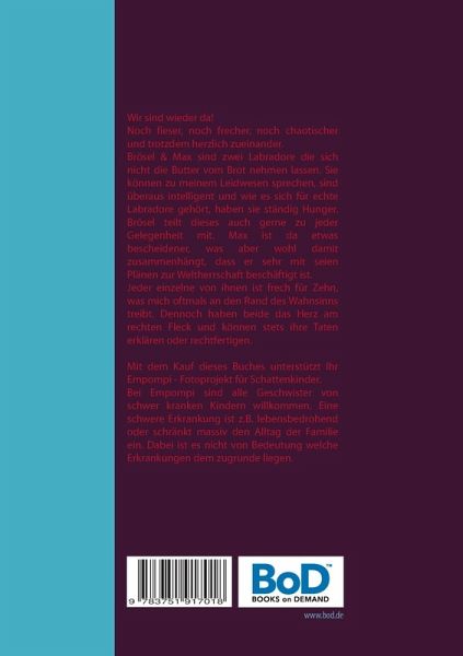 Wir sind wieder da!Noch fieser, noch frecher, noch chaotischer und trotzdem herzlich zueinander.Brösel & Max sind zwei Labradore die sich nicht die Butter vom Brot nehmen lassen. Sie können zu meinem Leidwesen sprechen, sind überaus intelligent und wie es sich für echte Labradore gehört, haben sie ständig Hunger. Brösel teilt dieses auch gerne zu jeder Gelegenheit mit. Max ist da etwas bescheidener, was aber wohl damit zusammenhängt, dass er sehr mit seien Plänen zur Weltherrschaft beschäftigt ist.Jeder einzelne von ihnen ist frech für Zehn, was mich oftmals an den Rand des Wahnsinns treibt. Dennoch haben beide das Herz am rechten Fleck und können stets ihre Taten erklären oder rechtfertigen. Mit dem Kauf dieses Buches unterstützt Ihr Empompi - Fotoprojekt für Schattenkinder.Bei Empompi sind alle Geschwister von schwer kranken Kindern willkommen. Eine schwere Erkrankung ist z.B. lebensbedrohend oder schränkt massiv den Alltag der Familie ein. Dabei ist es nicht von Bedeutung welche Erkrankungen dem zugrunde liegen.