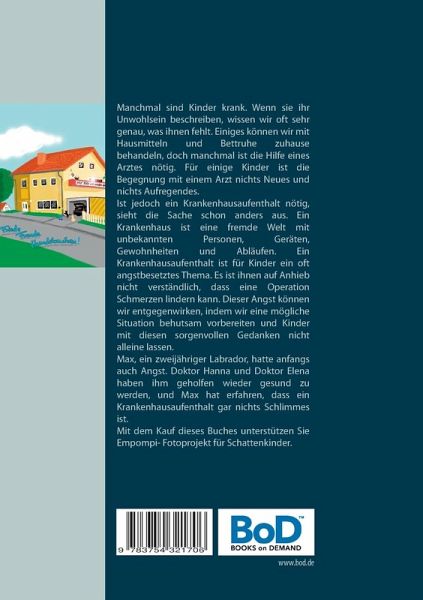Manchmal sind Kinder krank. Wenn sie ihr Unwohlsein beschreiben, wissen wir oft sehr genau, was ihnen fehlt. Einiges können wir mit Hausmitteln und Bettruhe zuhause behandeln, doch manchmal ist die Hilfe eines Arztes nötig. Für einige Kinder ist die Begegnung mit einem Arzt nichts Neues und nichts Aufregendes. Ist jedoch ein Krankenhausaufenthalt nötig, sieht die Sache schon anders aus. Ein Krankenhaus ist eine fremde Welt mit unbekannten Personen, Geräten, Gewohnheiten und Abläufen. Ein Krankenhausaufenthalt ist für Kinder ein oft angstbesetztes Thema. Es ist ihnen auf Anhieb nicht verständlich, dass eine Operation Schmerzen lindern kann. Dieser Angst können wir entgegenwirken, indem wir eine mögliche Situation behutsam vorbereiten und Kinder mit diesen sorgenvollen Gedanken nicht alleine lassen. Max, ein zweijähriger Labrador, hatte anfangs auch Angst. Doktor Hanna und Doktor Elena haben ihm geholfen wieder gesund zu werden, und Max hat erfahren, dass ein Krankenhausaufenthalt gar nichts Schlimmes ist.