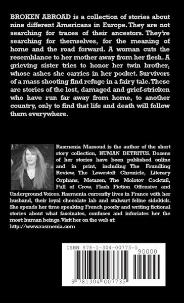 BROKEN ABROAD is a collection of stories about nine different Americans in Europe. They are not searching for traces of their ancestors. They're searching for themselves, for the meaning of home and the road forward. A woman cuts the resemblance to her mother away from her flesh. A grieving sister tries to honor her twin brother, whose ashes she carries in her pocket. Survivors of a mass shooting find refuge in a fairy tale. These are stories of the lost, damaged and grief-stricken who have run far away from home, to another country, only to find that life and death will follow them everywhere.