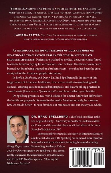 As Americans, we spend trillions of dollars more on healthcare than anyone else in the world, yet we have shorter lifespans. Patients are crushed by medical debt, sometimes forced to choose between paying for medications, rent, or food. Healthcare workers are burned out from being trapped in a broken system-one that has been the greatest rip-off of the American people this century. In Broken, Bankrupt, and Dying, Dr. Brad Spellberg tells the story of this tragic failure of American healthcare, from excess deaths to maddening inefficiencies, crushing costs to medical bankruptcies, and bizarre billing practices to absurd waste (learn what a "Johnson rod" is and how it affects your health). Dr. Spellberg presents a real-world solution for a better future that differs from the healthcare proposals discussed in the media. Most importantly, he shows us how we can do better-for our families, our businesses, and our society as a whole.