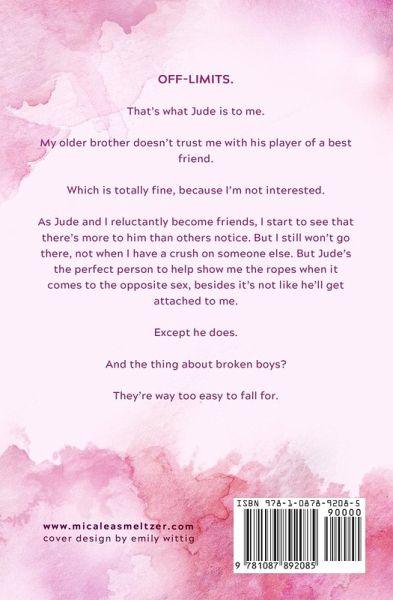 Off-limits. That's what Jude is to me. My older brother doesn't trust me with his player of a best friend. Which is totally fine, because I'm not interested. As Jude and I reluctantly become friends, I start to see that there's more to him than others notice. But I still won't go there, not when I have a crush on someone else. But Jude's the perfect person to help show me the ropes when it comes to the opposite sex, besides it's not like he'll get attached to me. Except he does. And the thing about broken boys? They're way too easy to fall for.