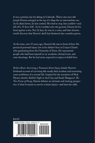 Huerta's BROKEN BRAIN: SURVIVING A TRAUMATIC BRAIN INJURY details his firsthand experience of living through a near-fatal brain injury. During a ski vacation in Colorado, Huerta fell off a fifteen-foot cliff and shattered his skull in countless pieces. For twelve days, he was in a coma and eventually woke up to the long journey of recovery. Told in a riveting & animated voice, this memoir delivers an intimate perspective on what it means to beat the odds.