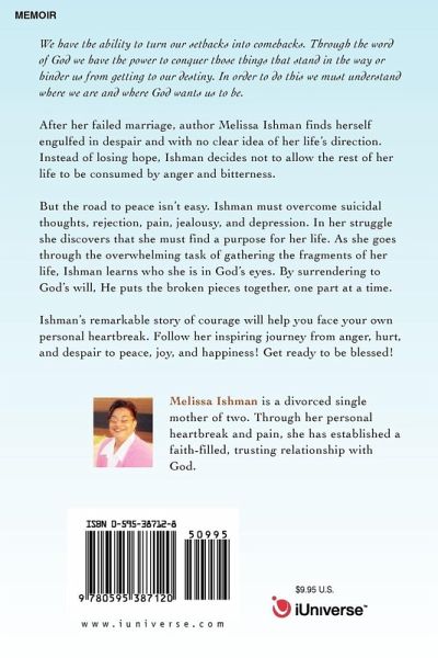 We have the ability to turn our setbacks into comebacks. Through the word of God we have the power to conquer those things that stand in the way or hinder us from getting to our destiny. In order to do this we must understand where we are and where God wants us to be. After her failed marriage, author Melissa Ishman finds herself engulfed in despair and with no clear idea of her life's direction. Instead of losing hope, Ishman decides not to allow the rest of her life to be consumed by anger and bitterness. But the road to peace isn't easy. Ishman must overcome suicidal thoughts, rejection, pain, jealousy, and depression. In her struggle she discovers that she must find a purpose for her life. As she goes through the overwhelming task of gathering the fragments of her life, Ishman learns who she is in God's eyes. By surrendering to God's will, He puts the broken pieces together, one part at a time. Ishman's remarkable story of courage will help you face your own personal heartbreak. Follow her inspiring journey from anger, hurt, and despair to peace, joy, and happiness! Get ready to be blessed!