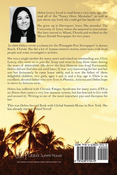 Debra Lowry loved to read from a very early age. She read all of the "Nancy Drew Mysteries", as well as just about any book she could get her hands on! She grew up in Davenport, Iowa. She attended The University of Iowa, where she majored in journalism. She later moved to Miami, Florida, and worked on the Miami Herald Newspaper for two years. In 2008 Debra wrote a column for the 'Pineapple Post Newspaper' in Jensen Beach, Florida. She did a lot of human interest stories, interviews with local people, and some investigative articles. She was a single mother for many years and raised an outstanding son, Chris Lowry, who went on to join the Army and went to Iraq three times during the years of 2003-2009. (He drove the first Humvee into Iraq! Fortunately, Debra did not find this out until later.) It was very harrowing for her and her son but fortunately, he came home safely and is now the father of three delightful children, two girls, ages 4 and 6, and a boy, age 8. Chris is an excellent, devoted father who now lives in Phoenix, Arizona, and Debra hope to move to Arizona soon. Debra has suffered from Chronic Fatigue Syndrome for many years (CFS is an illness that causes a very low immune system, but has learned to live with and around it). Writing is one of the most important joys and therapies for her. This was Debra Second Book with Global Summit House in New York. She has already started the third Novel!