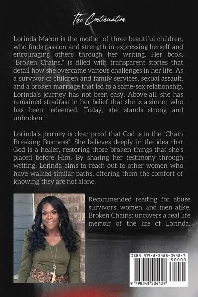 This transparent and transformative book delves into the essence of survival following some of the most broken experiences a woman can endure. In Broken Chains, author Lorinda Macon shares her extraordinary journey marked by fear, anguish, triumph, and forgiveness. Through her reflections on life-altering events, she invites readers to join her in reevaluating their lives and relationships with God. What Lorinda uncovers throughout her journey is surprising and inspiring; as she leans on her faith and personal journey, she emerges stronger than ever. The feeling of helplessness and loss gives way to a profound sense of empowerment rooted in her deep connection to God and reclaiming her life. Broken Chains: My Soul Remains Unbroken is a recommended read for survivors of abuse, as well as for women and men seeking help and understanding. This book intertwines prose, letters, and transparent storytelling, creating a revealing narrative and a guiding line through a woman's life from broken to Unbroken. Through Lorinda's vivid recollections, readers will discover they are not alone and may find the spiritual nourishment necessary to reclaim control over their lives.
