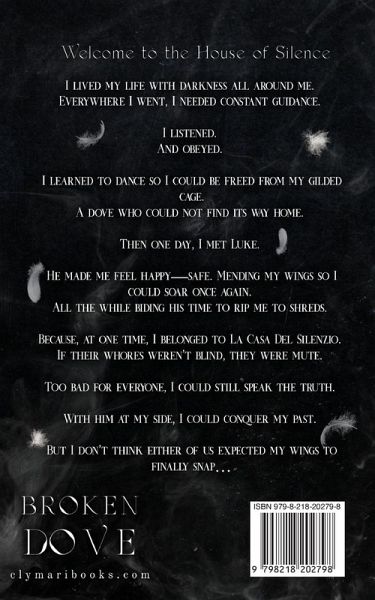Welcome to The House of Silence I lived my life with darkness all around me.¿ Everywhere I went, I needed constant guidance. I listened. And obeyed. I learned to dance so I could be freed from my gilded cage. A dove who could not find its way home. Then one day, I met Luke. He made me feel happy-safe. Mending my wings so I could soar once again. All the while biding his time to rip me to shreds. Because, at one time, I belonged to La Casa Del Silenzio. If their whores weren't blind, they were mute. Too bad for everyone, I could still speak the truth. With him at my side, I could conquer my past. But I don't think either of us expected my wings to finally snap...