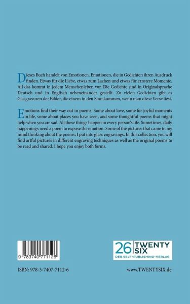 Dieses Buch handelt von Emotionen. Emotionen, die in Gedichten ihren Ausdruck finden. Etwas für die Liebe, etwas zum Lachen und etwas für ernstere Momente. All das kommt in jedem Menschenleben vor. Die Gedichte sind in Originalsprache Deutsch und in Englisch nebeneinander gestellt. Zu vielen Gedichten gibt es Glasgravuren der Bilder, die einem in den Sinn kommen, wenn man diese Verse liest. Emotions find their way out in poems. Some about love, some for joyful moments in life, some about places you have seen, and some thoughtful poems that might help when you are sad. All these things happen in every person's life. Sometimes, daily happenings need a poem to expose the emotion. Some of the pictures that came to my mind thinking about the poems, I put into glass engravings. In this collection, you will find artful pictures in different engraving techniques as well as the original poems to be read and shared. I hope you enjoy both forms.