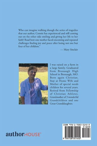 Who can imagine walking though the series of tragedies that our author, Connie has experienced and still coming out on the other side smiling and giving her life to her faith? Read how one mother faced oncoming and repeated challenges finding joy and peace after losing not one but four of her children." - Mary Sinclair